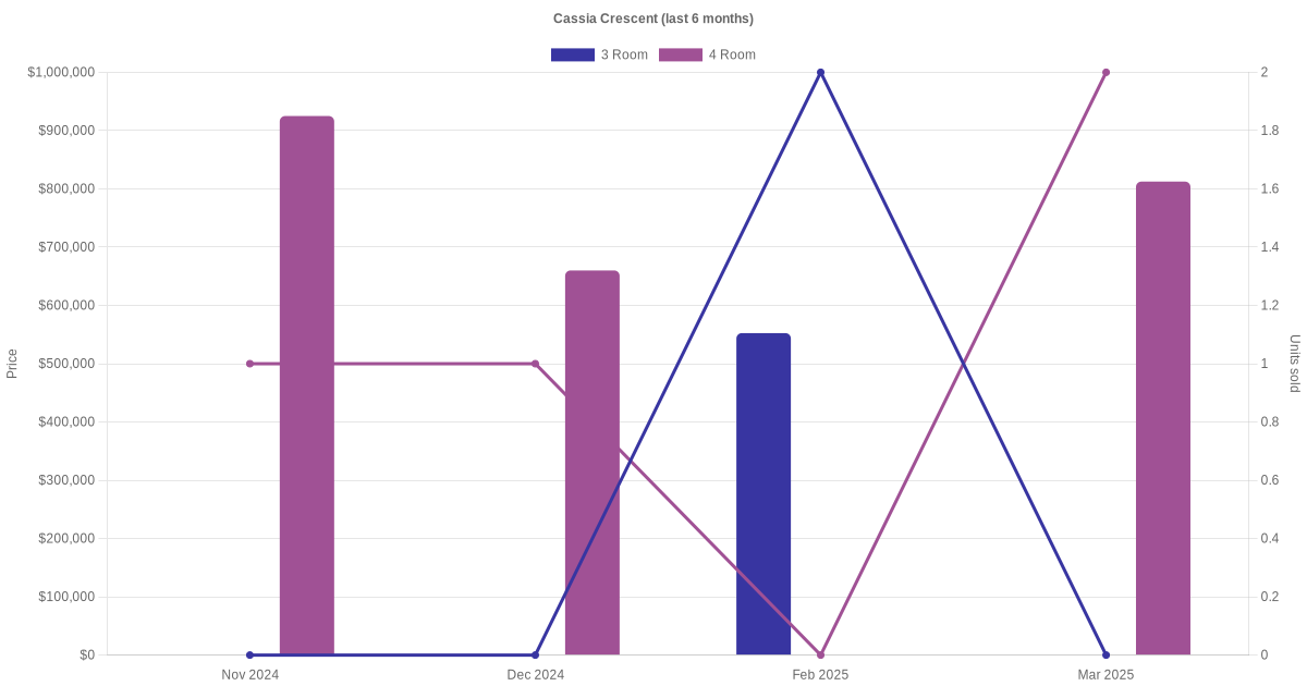Located along Cassia Crescent are various HDB flat types including 3 room, 4 room and 5 room units. Shown below is a view of the resale price and transactions trends, broken down by month, in the last 3 years.
