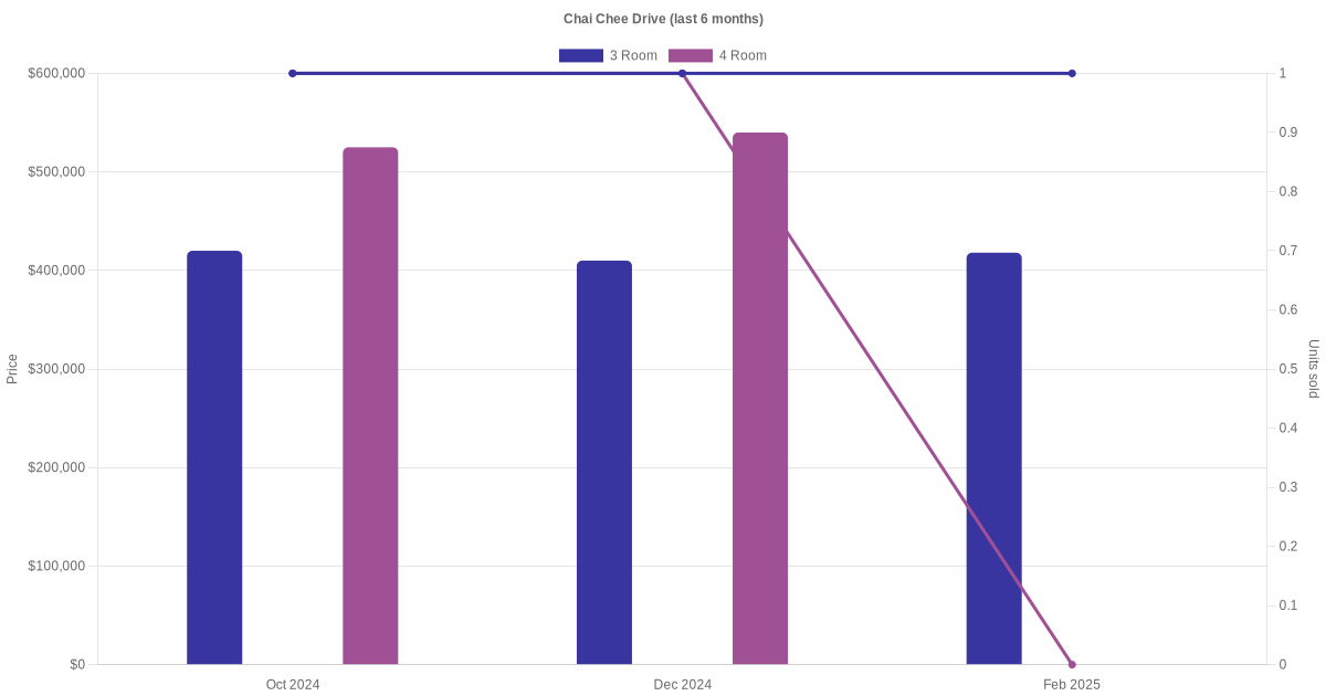 Located along Chai Chee Drive are various HDB flat types including 3 room and 4 room units. Shown below is a view of the resale price and transactions trends, broken down by month, in the last 3 years.