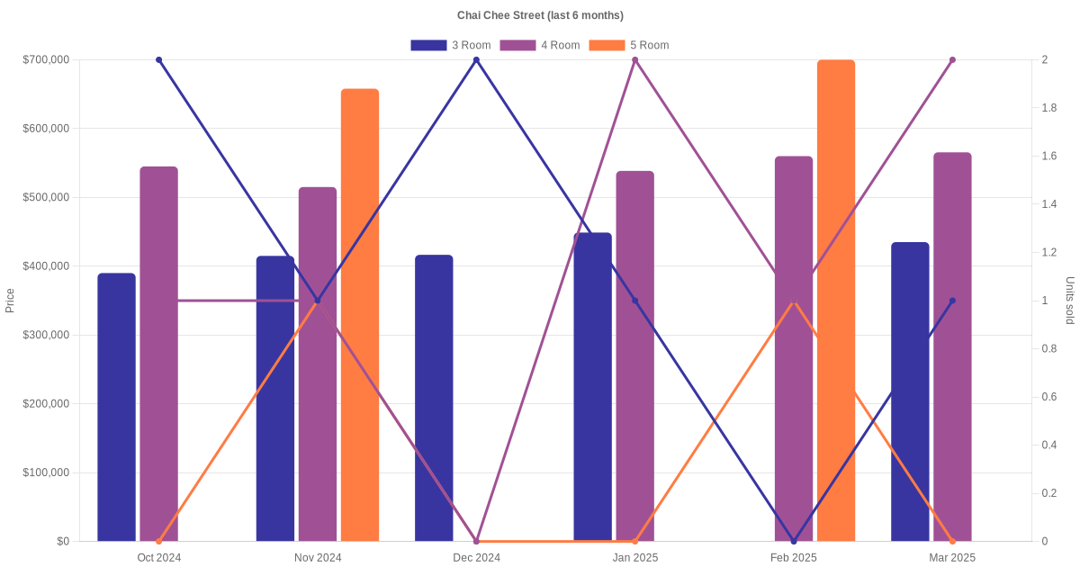 Located along Chai Chee Street are various HDB flat types including 3 room, 4 room, 5 room and executive units. Shown below is a view of the resale price and transactions trends, broken down by month, in the last 3 years.