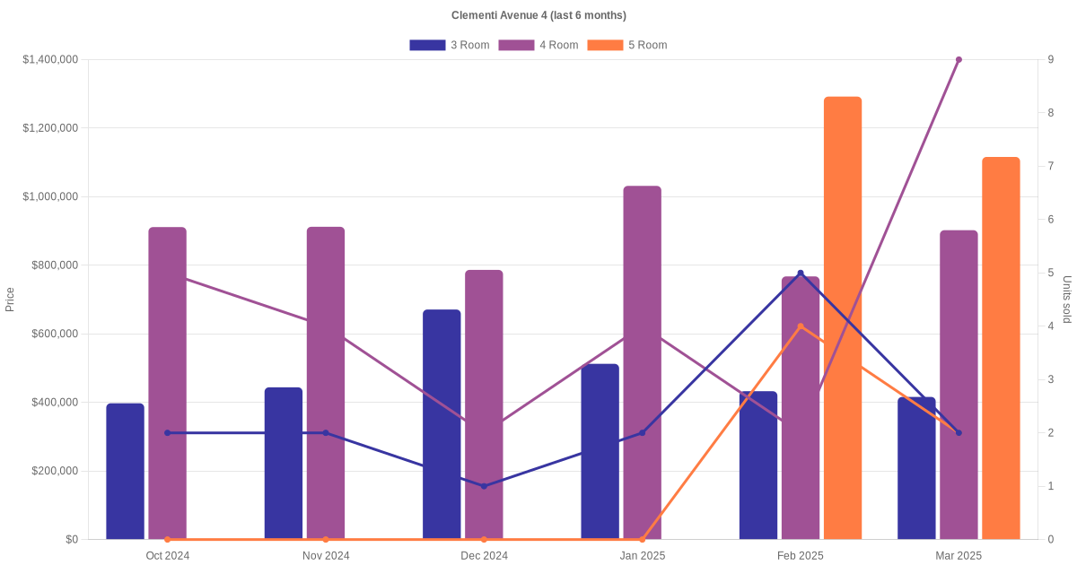 Located along Clementi Avenue 4 are various HDB flat types including 3 room, 4 room, 5 room and executive units. Shown below is a view of the resale price and transactions trends, broken down by month, in the last 3 years.