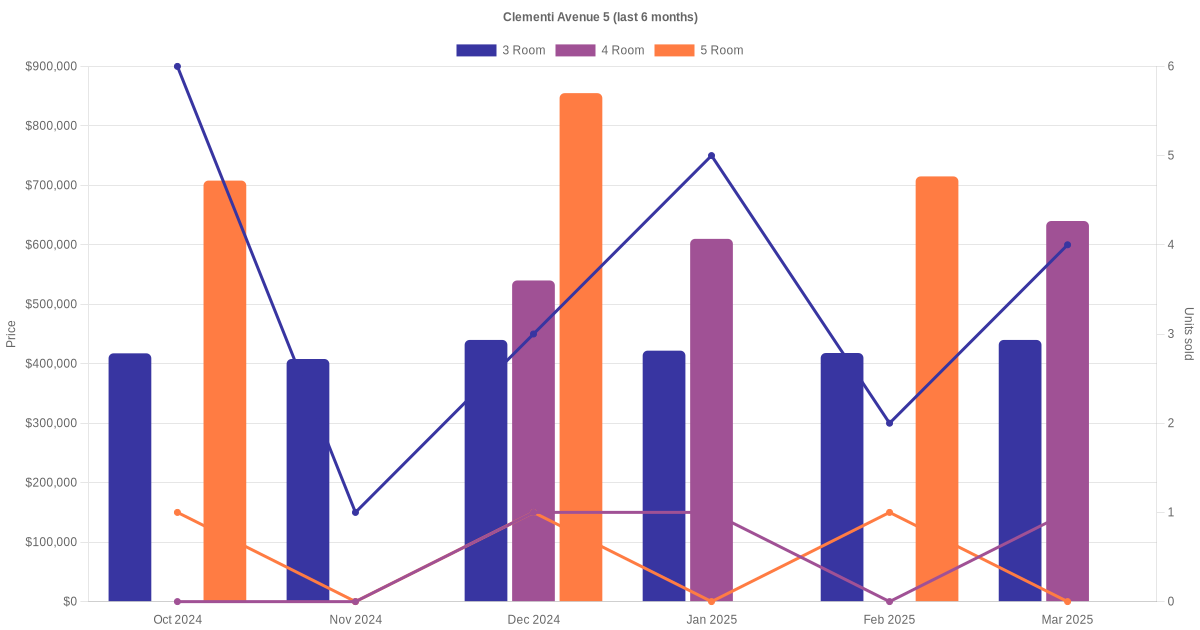 Located along Clementi Avenue 5 are various HDB flat types including 2 room, 3 room, 4 room and 5 room units. Shown below is a view of the resale price and transactions trends, broken down by month, in the last 3 years.