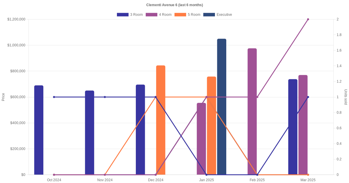 Located along Clementi Avenue 6 are various HDB flat types including 3 room, 4 room, 5 room and executive units. Shown below is a view of the resale price and transactions trends, broken down by month, in the last 3 years.