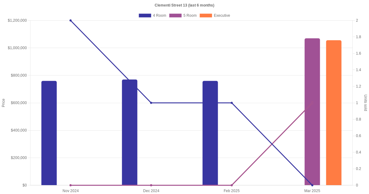 Located along Clementi Street 13 are various HDB flat types including 4 room, 5 room and executive units. Shown below is a view of the resale price and transactions trends, broken down by month, in the last 3 years.