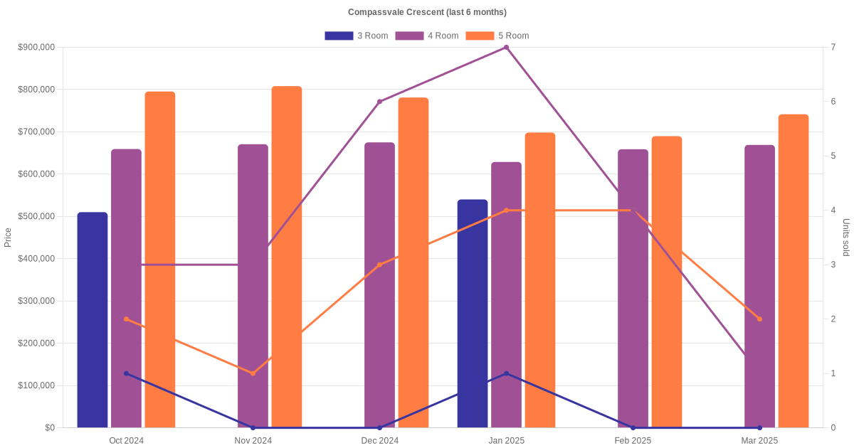 Located along Compassvale Crescent are various HDB flat types including 3 room, 4 room and 5 room units. Shown below is a view of the resale price and transactions trends, broken down by month, in the last 3 years.