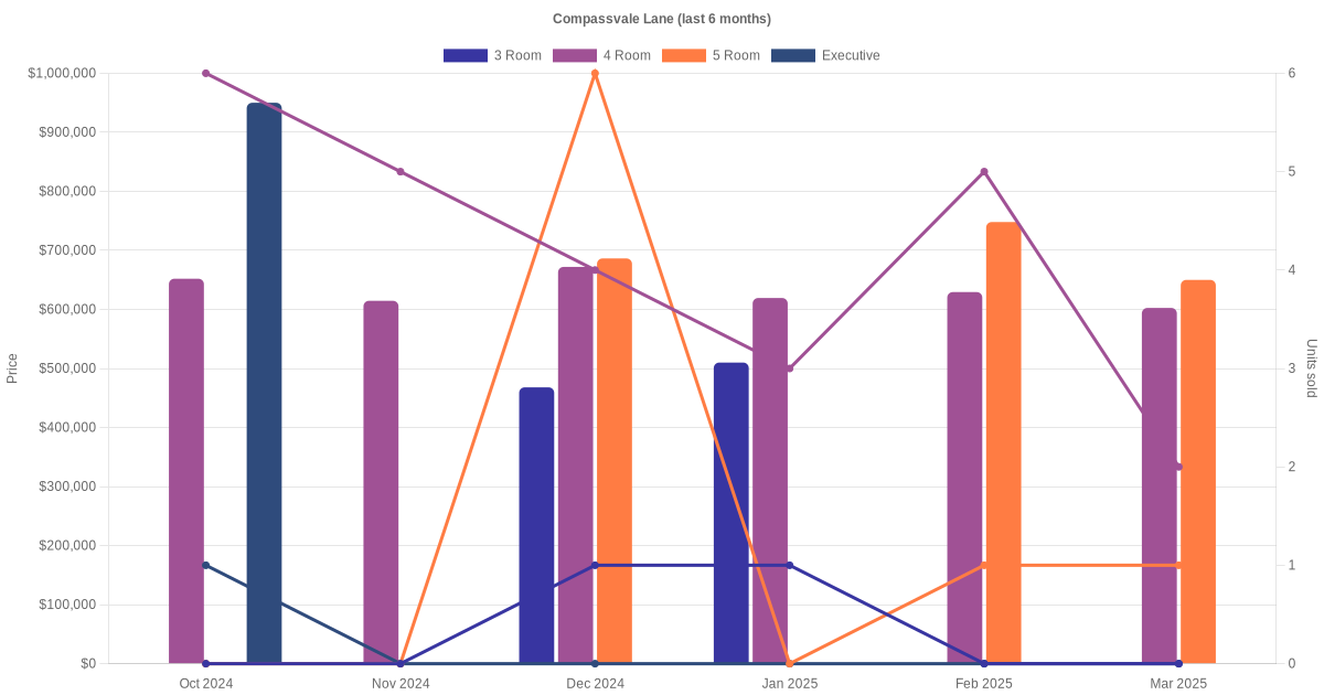 Located along Compassvale Lane are various HDB flat types including 2 room, 3 room, 4 room, 5 room and executive units. Shown below is a view of the resale price and transactions trends, broken down by month, in the last 3 years.