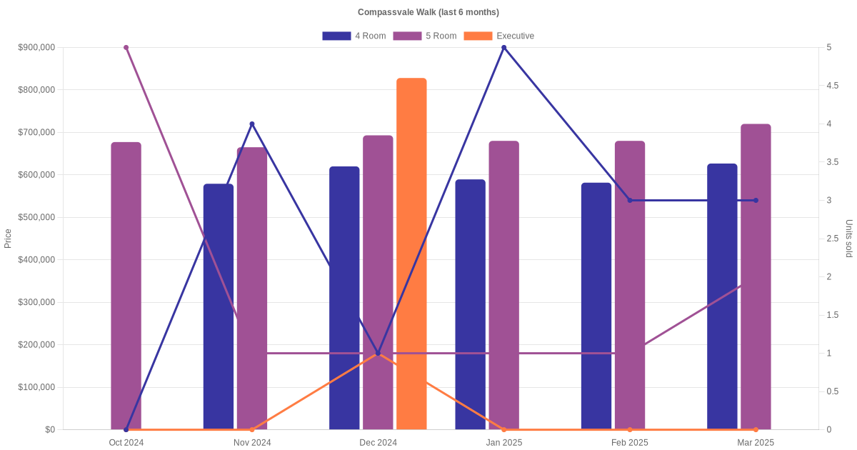 Located along Compassvale Walk are various HDB flat types including 4 room, 5 room and executive units. Shown below is a view of the resale price and transactions trends, broken down by month, in the last 3 years.