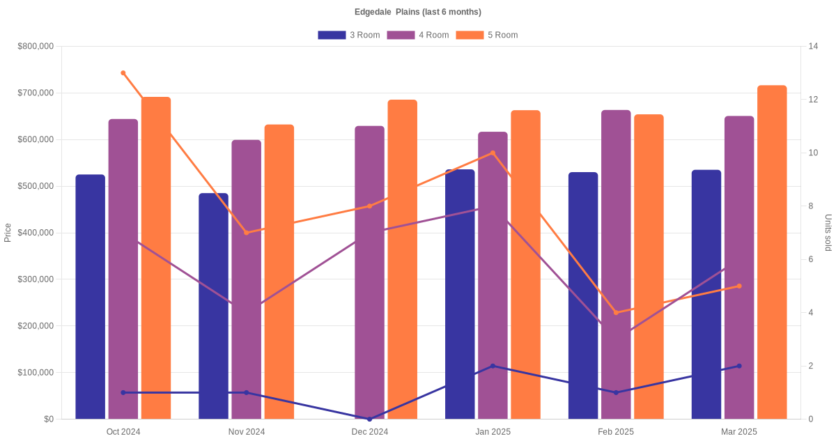 Located along Edgedale Plains are various HDB flat types including 3 room, 4 room and 5 room units. Shown below is a view of the resale price and transactions trends, broken down by month, in the last 3 years.