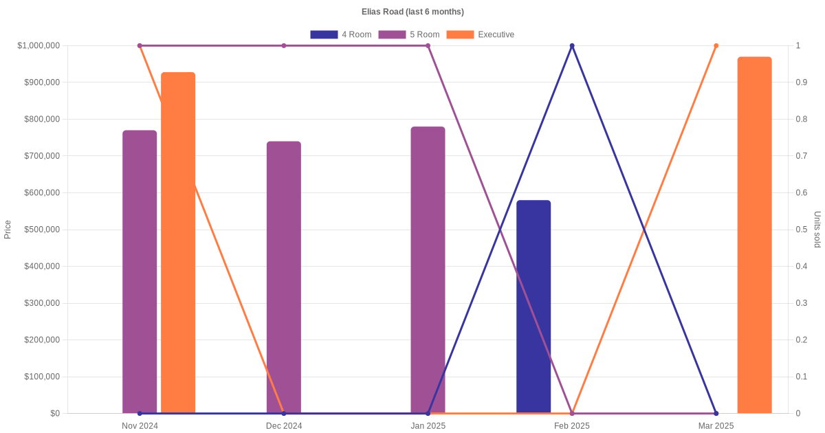 Located along Elias Road are various HDB flat types including 4 room, 5 room and executive units. Shown below is a view of the resale price and transactions trends, broken down by month, in the last 3 years.