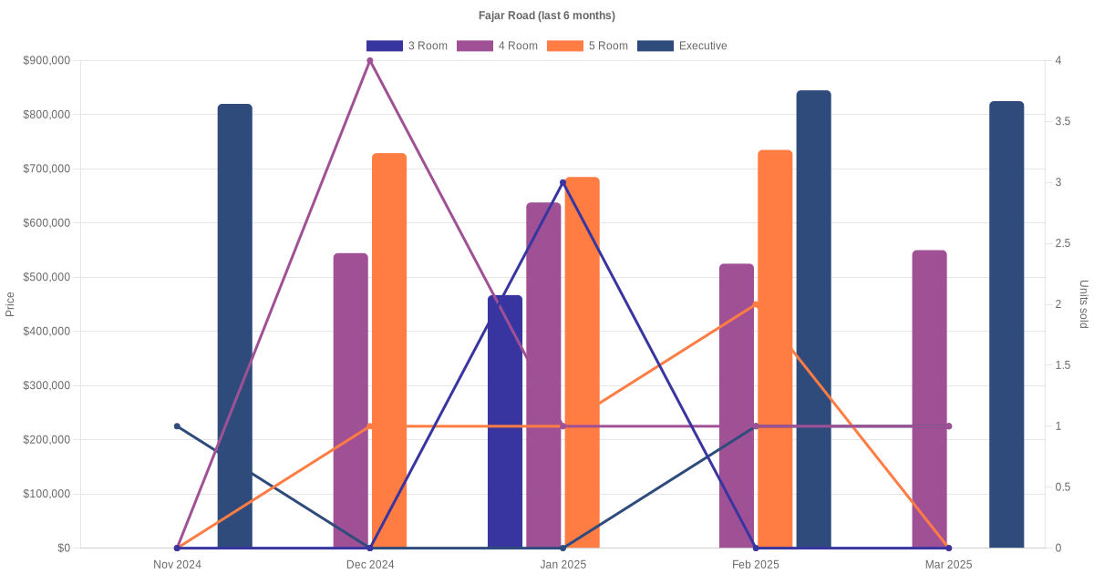 Located along Fajar Road are various HDB flat types including 3 room, 4 room, 5 room and executive units. Shown below is a view of the resale price and transactions trends, broken down by month, in the last 3 years.