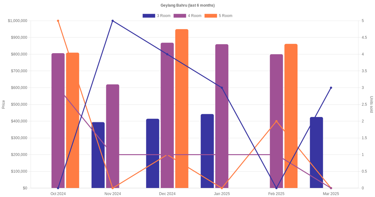 Located along Geylang Bahru are various HDB flat types including 3 room, 4 room and 5 room units. Shown below is a view of the resale price and transactions trends, broken down by month, in the last 3 years.