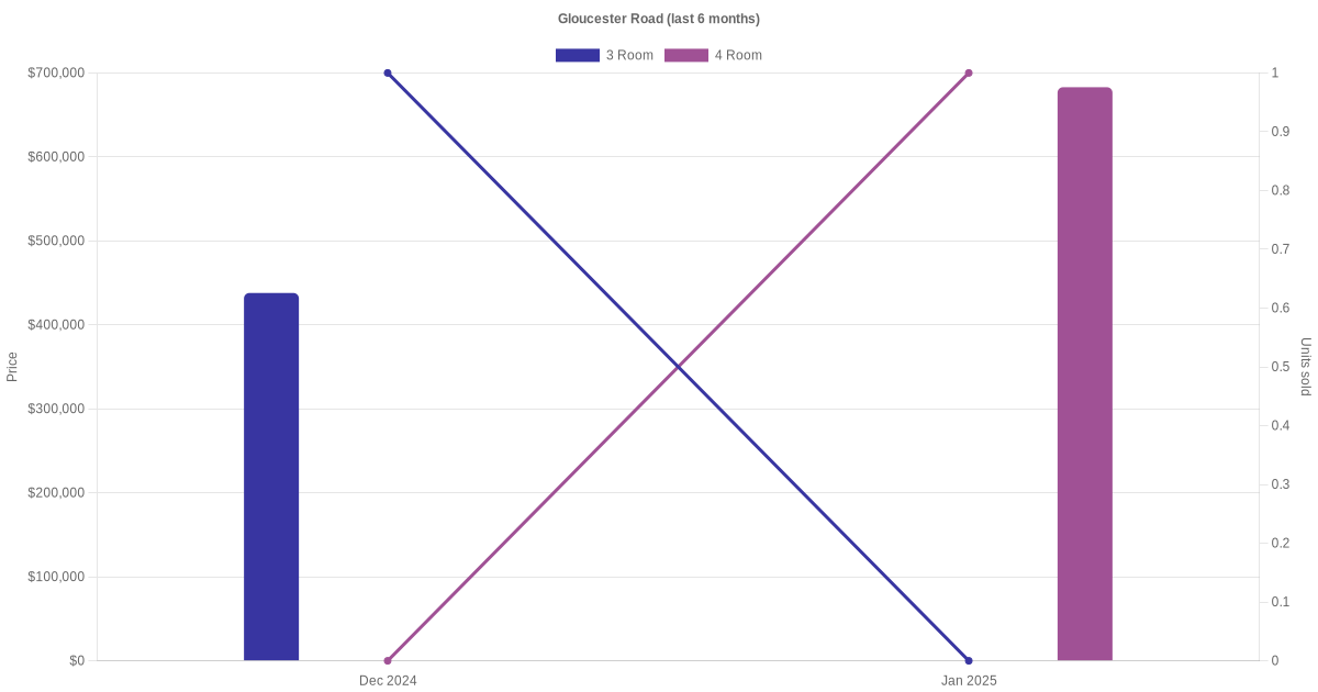 Located along Gloucester Road are various HDB flat types including 3 room and 4 room units. Shown below is a view of the resale price and transactions trends, broken down by month, in the last 3 years.