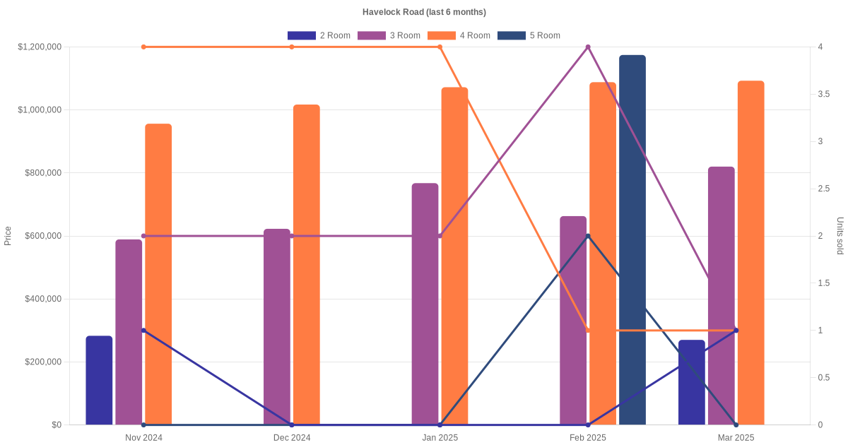 Located along Havelock Road are various HDB flat types including 2 room, 3 room, 4 room and 5 room units. Shown below is a view of the resale price and transactions trends, broken down by month, in the last 3 years.