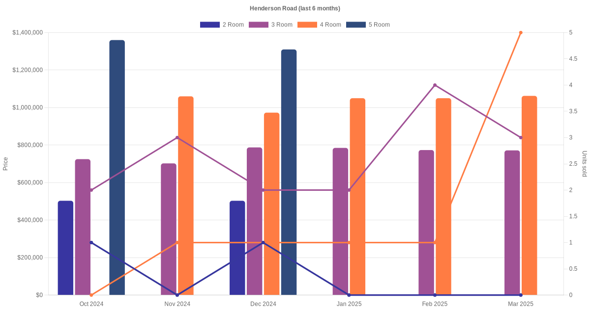 Located along Henderson Road are various HDB flat types including 2 room, 3 room, 4 room and 5 room units. Shown below is a view of the resale price and transactions trends, broken down by month, in the last 3 years.