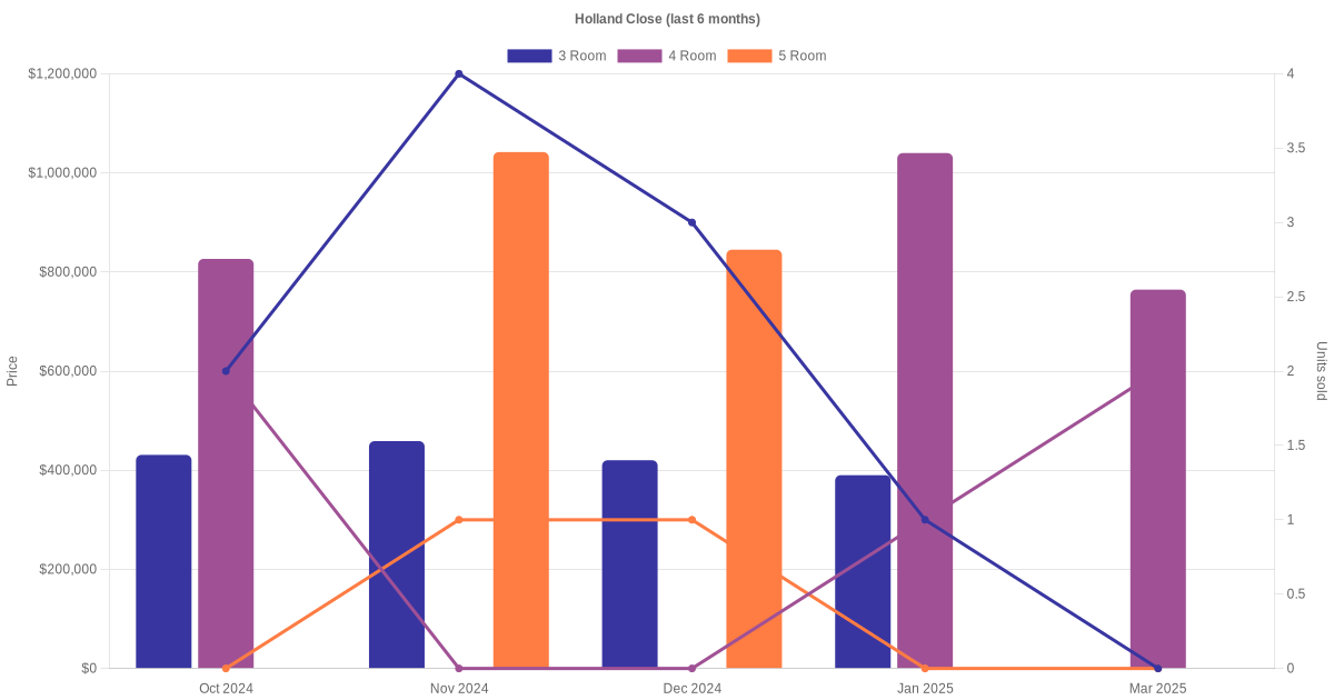 Located along Holland Close are various HDB flat types including 3 room, 4 room and 5 room units. Shown below is a view of the resale price and transactions trends, broken down by month, in the last 3 years.