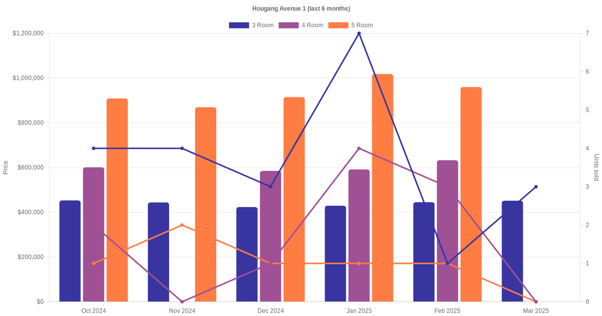 Located along Hougang Avenue 1 are various HDB flat types including 3 room, 4 room, 5 room and executive units. Shown below is a view of the resale price and transactions trends, broken down by month, in the last 3 years.