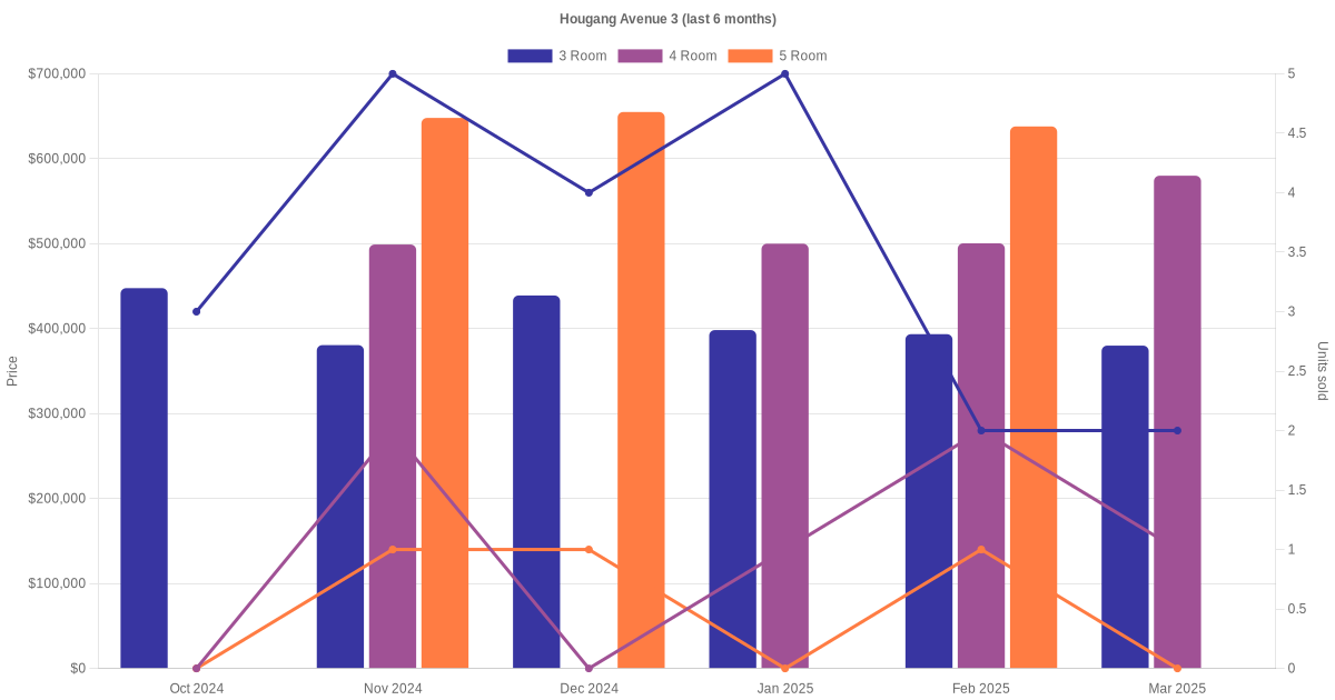 Located along Hougang Avenue 3 are various HDB flat types including 3 room, 4 room and 5 room units. Shown below is a view of the resale price and transactions trends, broken down by month, in the last 3 years.