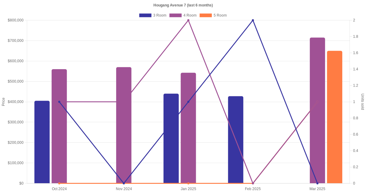 Located along Hougang Avenue 7 are various HDB flat types including 3 room, 4 room, 5 room and executive units. Shown below is a view of the resale price and transactions trends, broken down by month, in the last 3 years.
