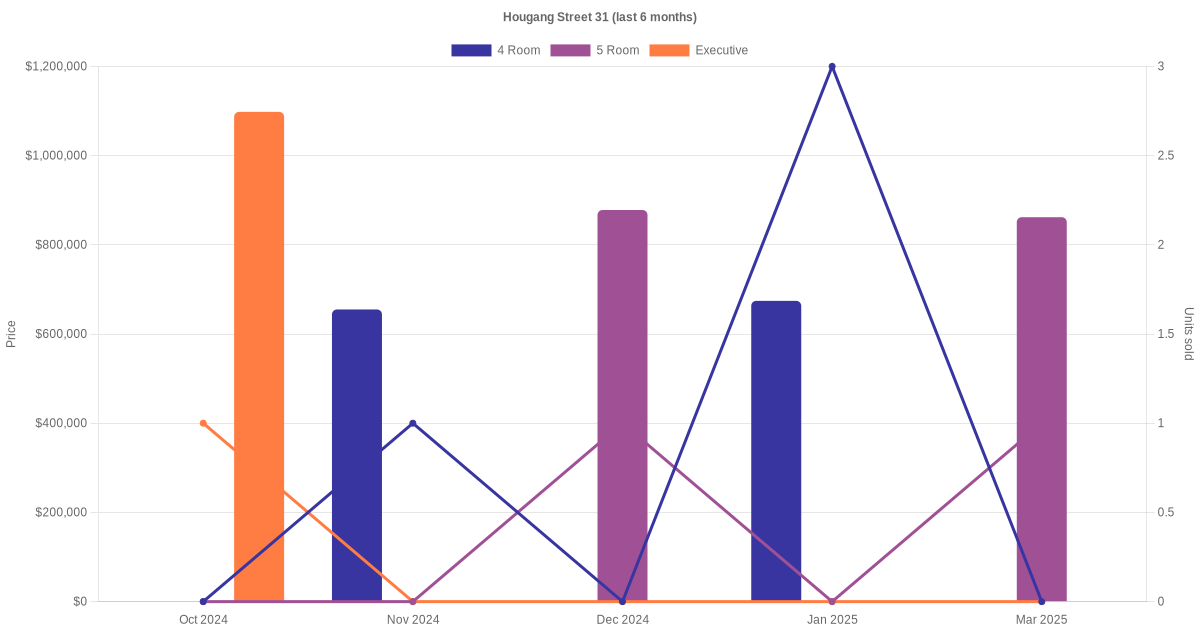 Located along Hougang Street 31 are various HDB flat types including 4 room, 5 room and executive units. Shown below is a view of the resale price and transactions trends, broken down by month, in the last 3 years.