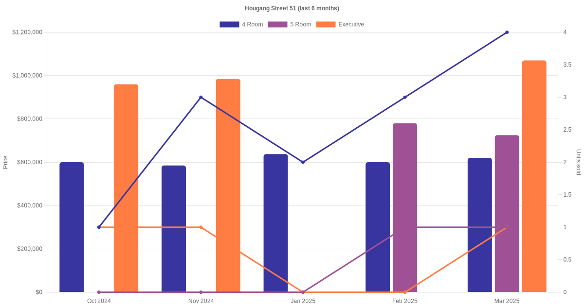 Located along Hougang Street 51 are various HDB flat types including 4 room, 5 room and executive units. Shown below is a view of the resale price and transactions trends, broken down by month, in the last 3 years.