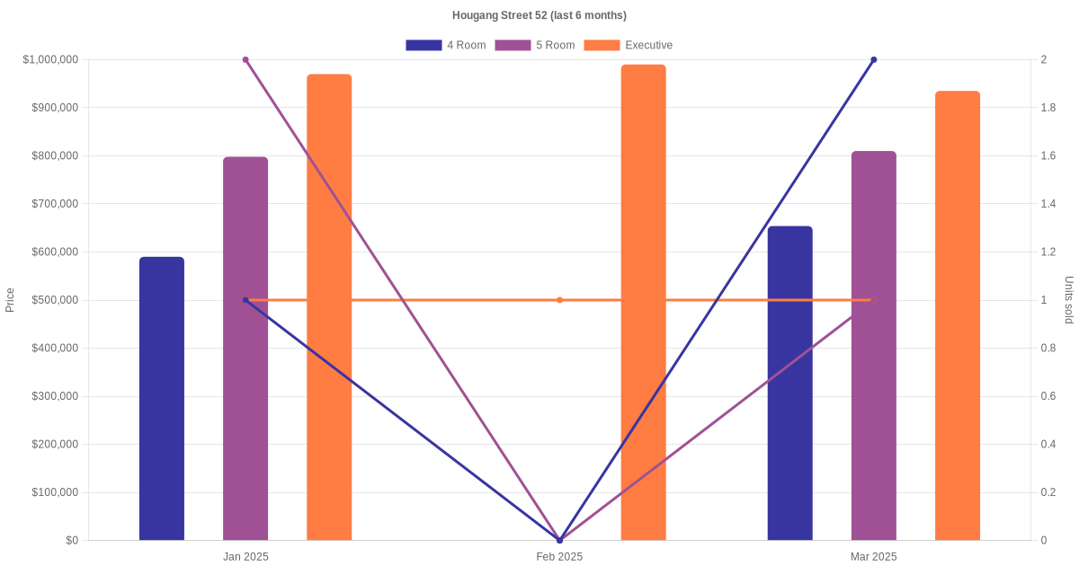 Located along Hougang Street 52 are various HDB flat types including 4 room, 5 room and executive units. Shown below is a view of the resale price and transactions trends, broken down by month, in the last 3 years.