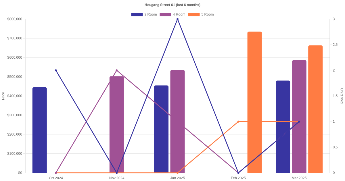 Located along Hougang Street 61 are various HDB flat types including 3 room, 4 room and 5 room units. Shown below is a view of the resale price and transactions trends, broken down by month, in the last 3 years.
