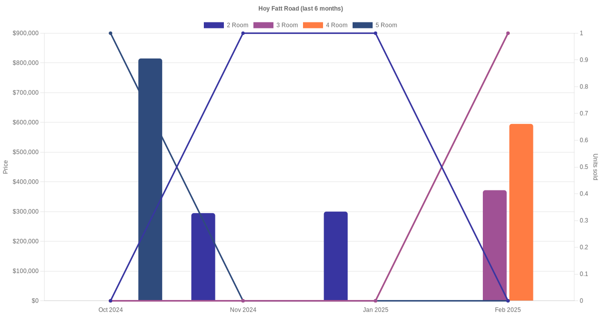 Located along Hoy Fatt Road are various HDB flat types including 2 room, 3 room, 4 room and 5 room units. Shown below is a view of the resale price and transactions trends, broken down by month, in the last 3 years.