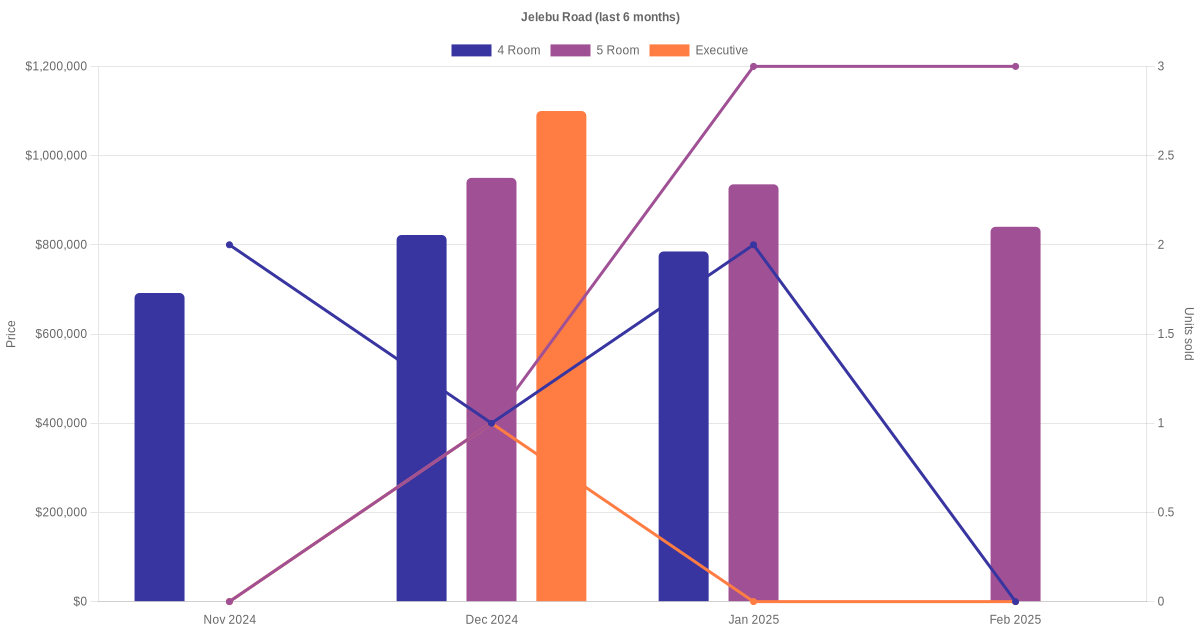 Located along Jelebu Road are various HDB flat types including 4 room, 5 room and executive units. Shown below is a view of the resale price and transactions trends, broken down by month, in the last 3 years.