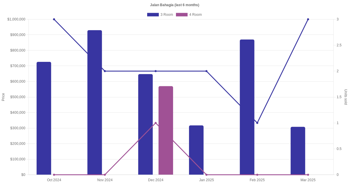 Located along Jalan Bahagia are various HDB flat types including 3 room, 4 room and 5 room units. Shown below is a view of the resale price and transactions trends, broken down by month, in the last 3 years.