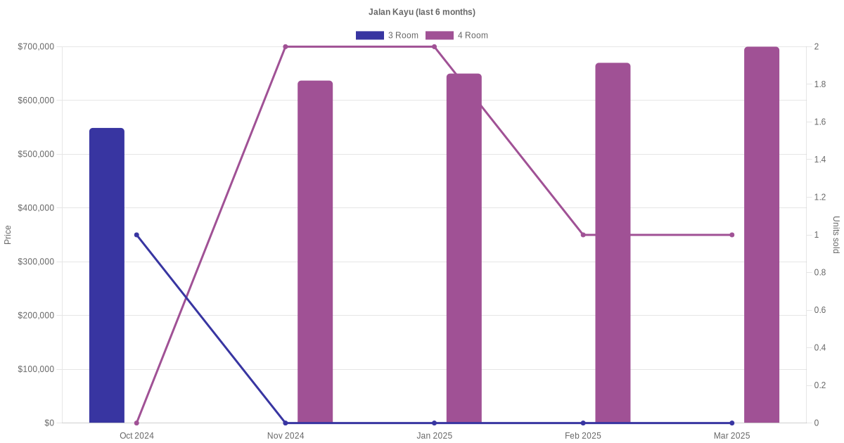 Located along Jalan Kayu are various HDB flat types including 2 room, 3 room and 4 room units. Shown below is a view of the resale price and transactions trends, broken down by month, in the last 3 years.
