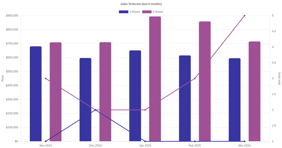Located along Jalan Tenteram are various HDB flat types including 3 room, 4 room and 5 room units. Shown below is a view of the resale price and transactions trends, broken down by month, in the last 3 years.