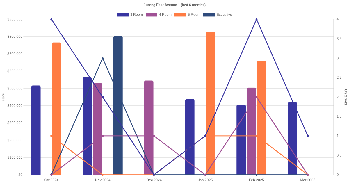 Located along Jurong East Avenue 1 are various HDB flat types including 3 room, 4 room, 5 room and executive units. Shown below is a view of the resale price and transactions trends, broken down by month, in the last 3 years.