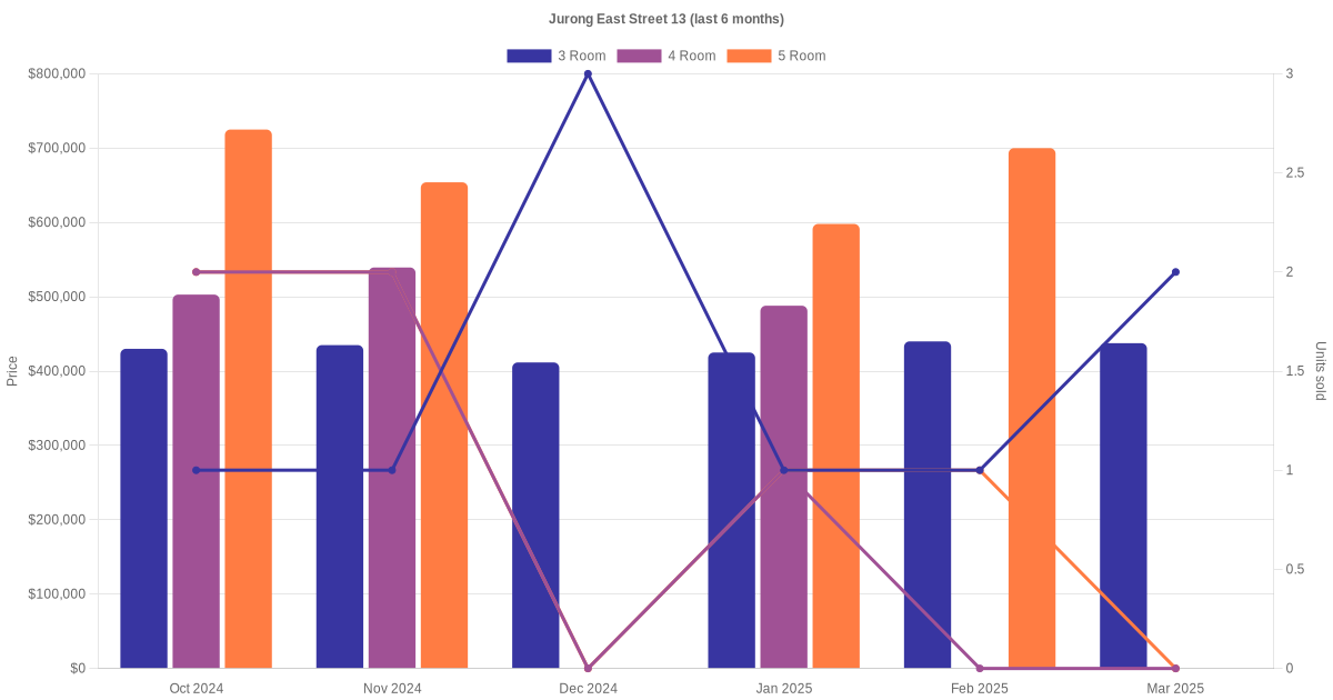 Located along Jurong East Street 13 are various HDB flat types including 3 room, 4 room, 5 room and executive units. Shown below is a view of the resale price and transactions trends, broken down by month, in the last 3 years.