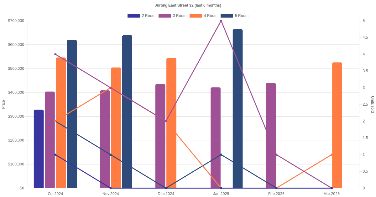 Located along Jurong East Street 32 are various HDB flat types including 2 room, 3 room, 4 room and 5 room units. Shown below is a view of the resale price and transactions trends, broken down by month, in the last 3 years.