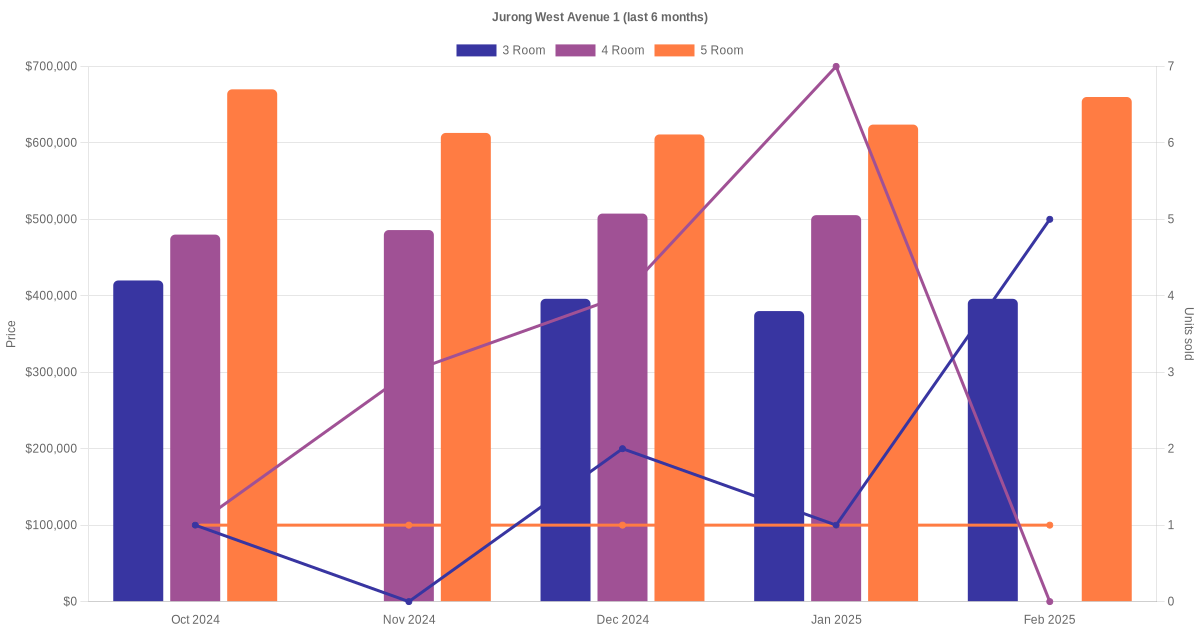 Located along Jurong West Avenue 1 are various HDB flat types including 3 room, 4 room and 5 room units. Shown below is a view of the resale price and transactions trends, broken down by month, in the last 3 years.