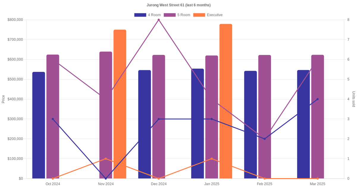 Located along Jurong West Street 61 are various HDB flat types including 4 room, 5 room and executive units. Shown below is a view of the resale price and transactions trends, broken down by month, in the last 3 years.