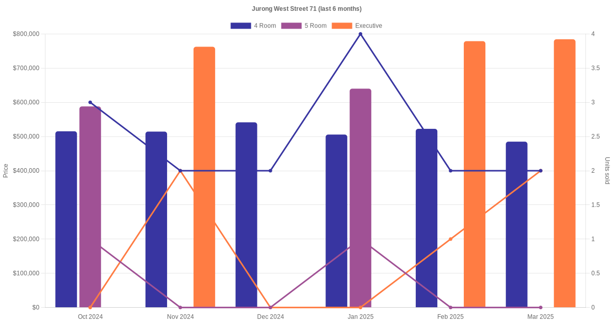 Located along Jurong West Street 71 are various HDB flat types including 4 room, 5 room and executive units. Shown below is a view of the resale price and transactions trends, broken down by month, in the last 3 years.