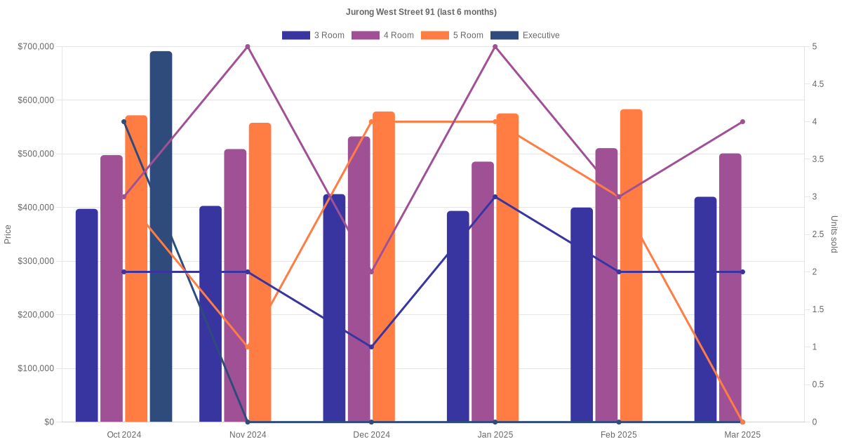 Located along Jurong West Street 91 are various HDB flat types including 3 room, 4 room, 5 room and executive units. Shown below is a view of the resale price and transactions trends, broken down by month, in the last 3 years.