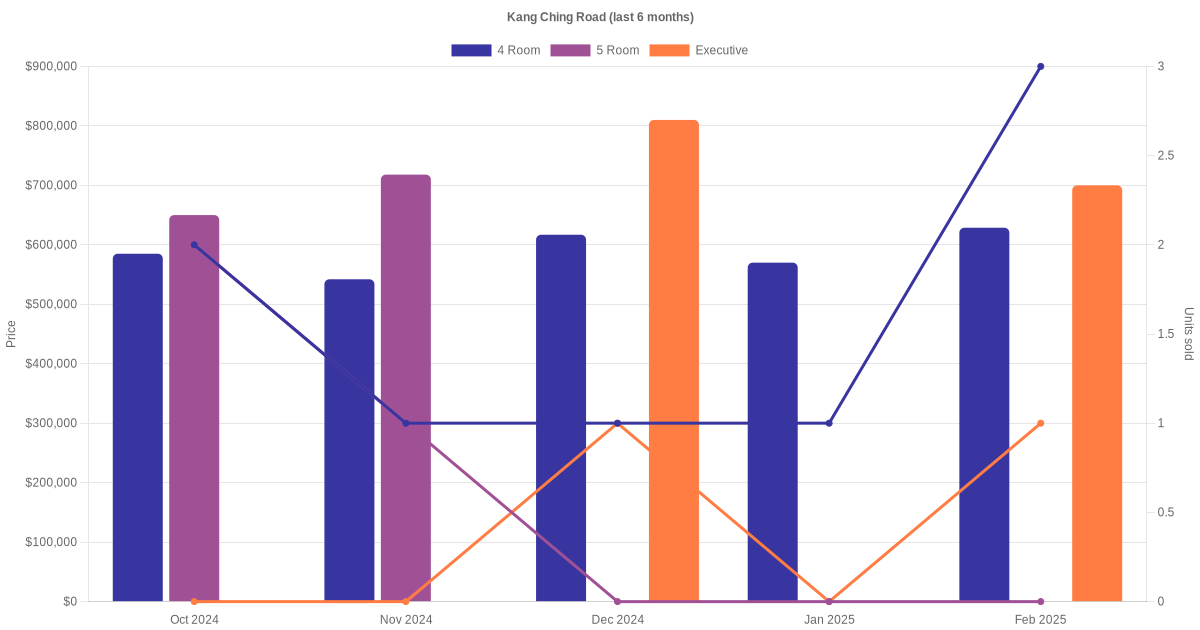 Located along Kang Ching Road are various HDB flat types including 3 room, 4 room, 5 room and executive units. Shown below is a view of the resale price and transactions trends, broken down by month, in the last 3 years.