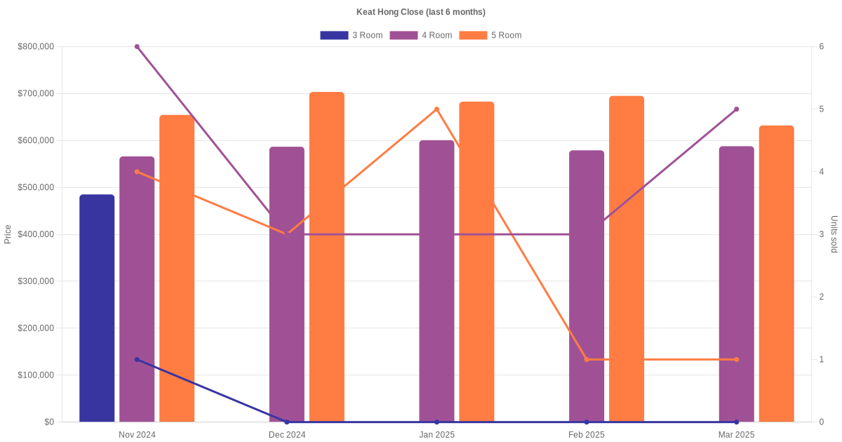 Located along Keat Hong Close are various HDB flat types including 3 room, 4 room and 5 room units. Shown below is a view of the resale price and transactions trends, broken down by month, in the last 3 years.