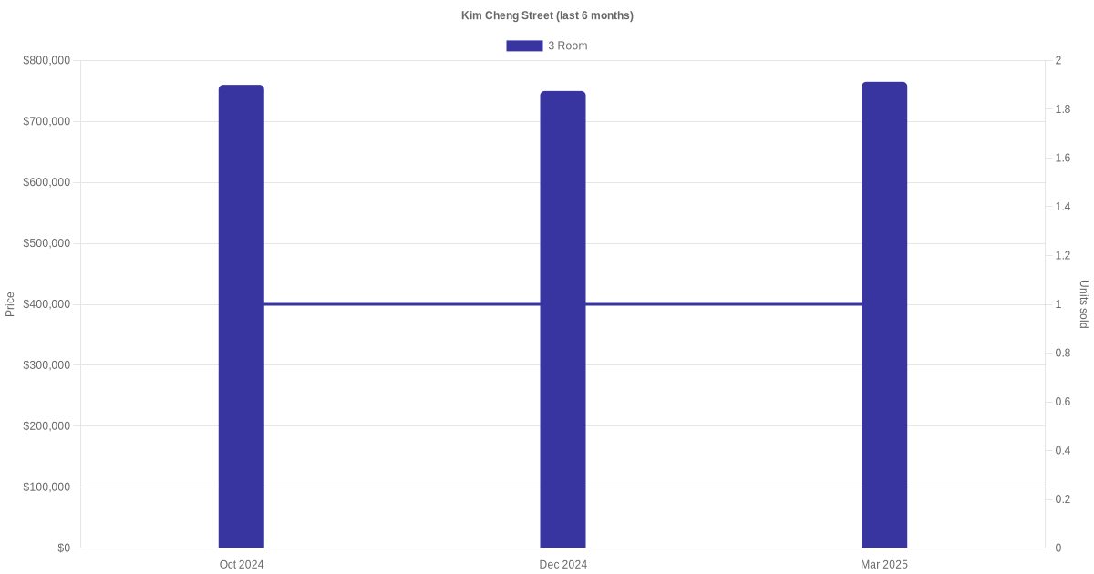 Located along Kim Cheng Street are various HDB flat types including 3 room units. Shown below is a view of the resale price and transactions trends, broken down by month, in the last 3 years.