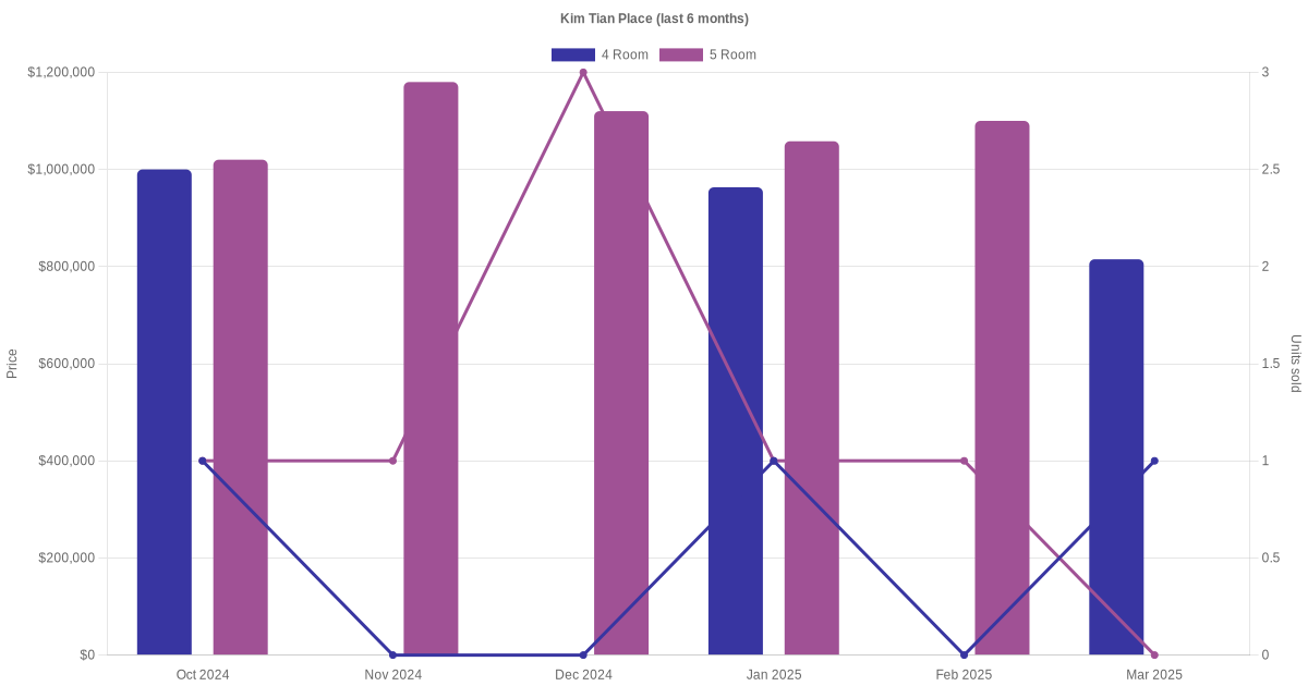 Located along Kim Tian Place are various HDB flat types including 4 room and 5 room units. Shown below is a view of the resale price and transactions trends, broken down by month, in the last 3 years.
