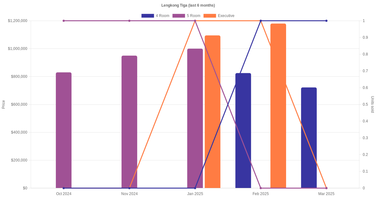 Located along Lengkong Tiga are various HDB flat types including 4 room, 5 room and executive units. Shown below is a view of the resale price and transactions trends, broken down by month, in the last 3 years.