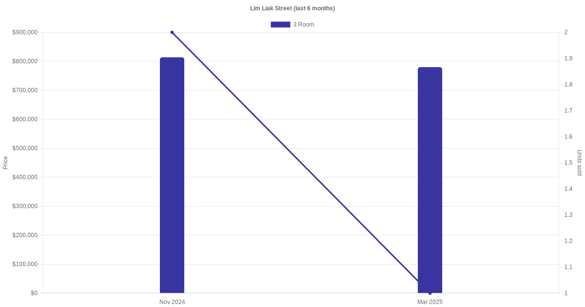 Located along Lim Liak Street are various HDB flat types including 3 room units. Shown below is a view of the resale price and transactions trends, broken down by month, in the last 3 years.