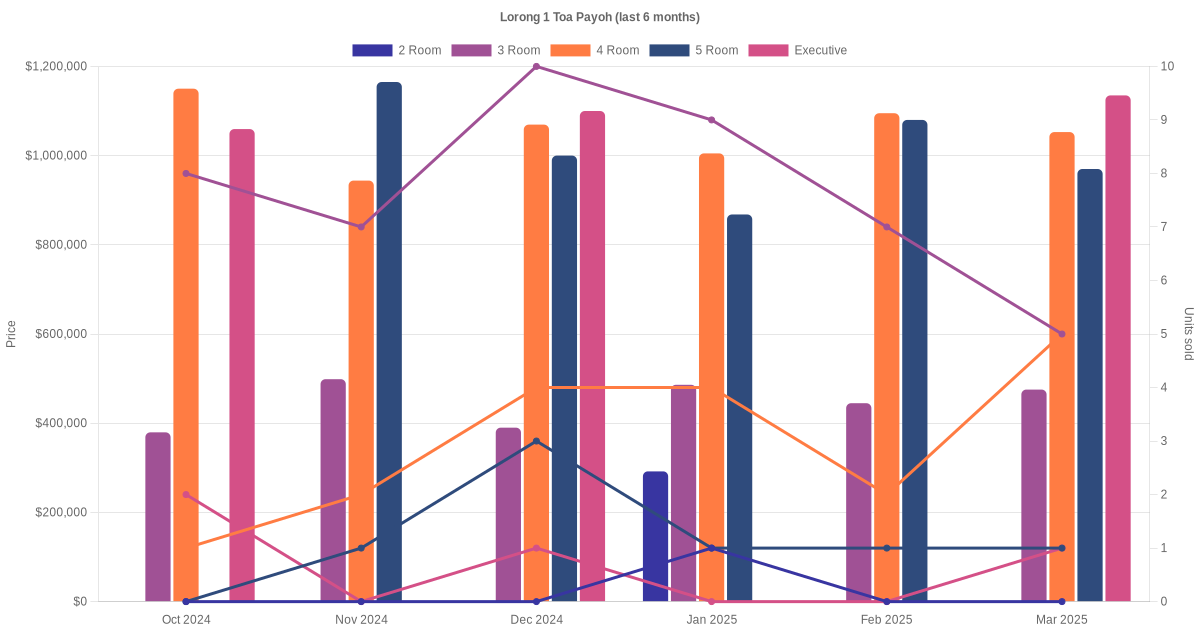 Located along Lorong 1 Toa Payoh are various HDB flat types including 2 room, 3 room, 4 room, 5 room and executive units. Shown below is a view of the resale price and transactions trends, broken down by month, in the last 3 years.