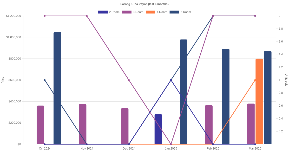 Located along Lorong 5 Toa Payoh are various HDB flat types including 2 room, 3 room, 4 room and 5 room units. Shown below is a view of the resale price and transactions trends, broken down by month, in the last 3 years.