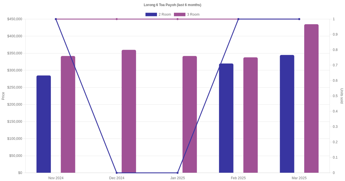 Located along Lorong 6 Toa Payoh are various HDB flat types including 2 room and 3 room units. Shown below is a view of the resale price and transactions trends, broken down by month, in the last 3 years.