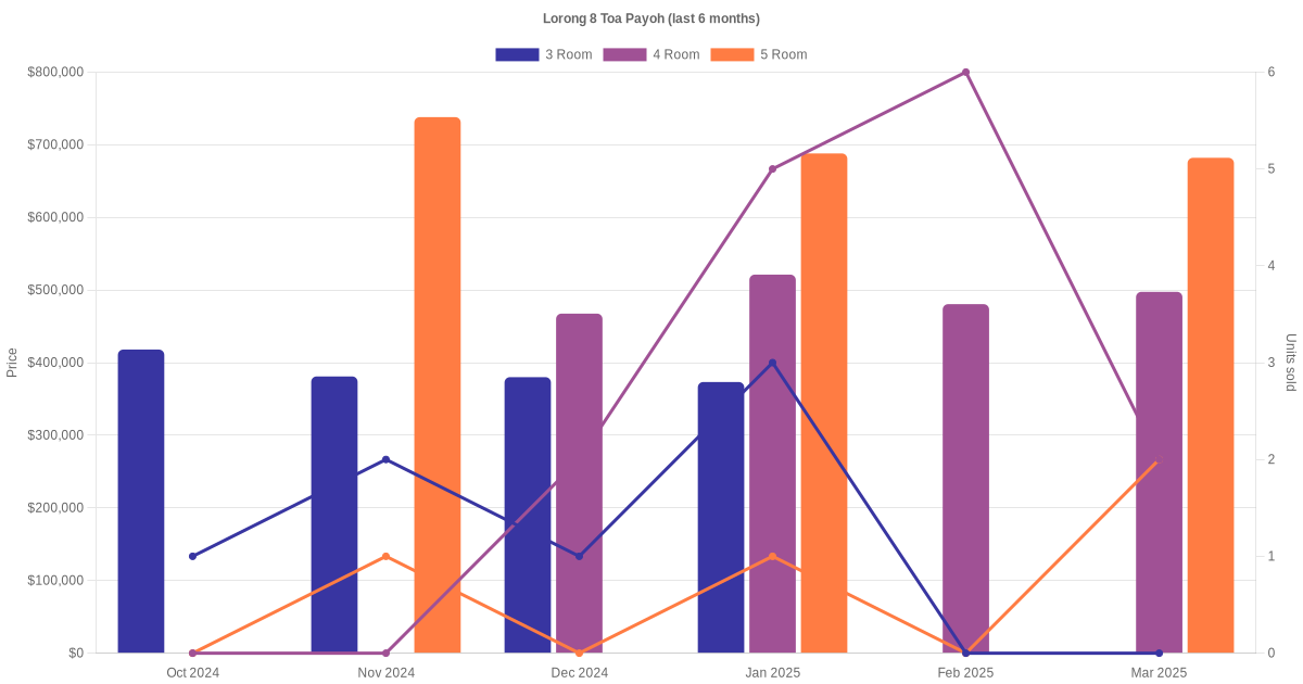 Located along Lorong 8 Toa Payoh are various HDB flat types including 3 room, 4 room and 5 room units. Shown below is a view of the resale price and transactions trends, broken down by month, in the last 3 years.