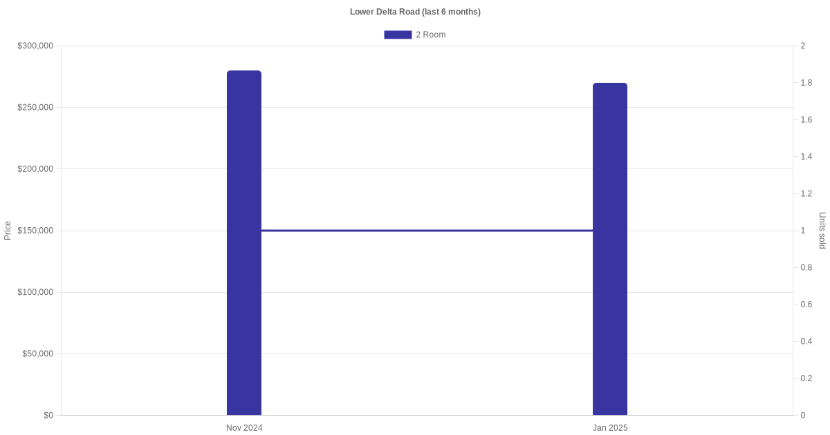 Located along Lower Delta Road are various HDB flat types including 2 room units. Shown below is a view of the resale price and transactions trends, broken down by month, in the last 3 years.