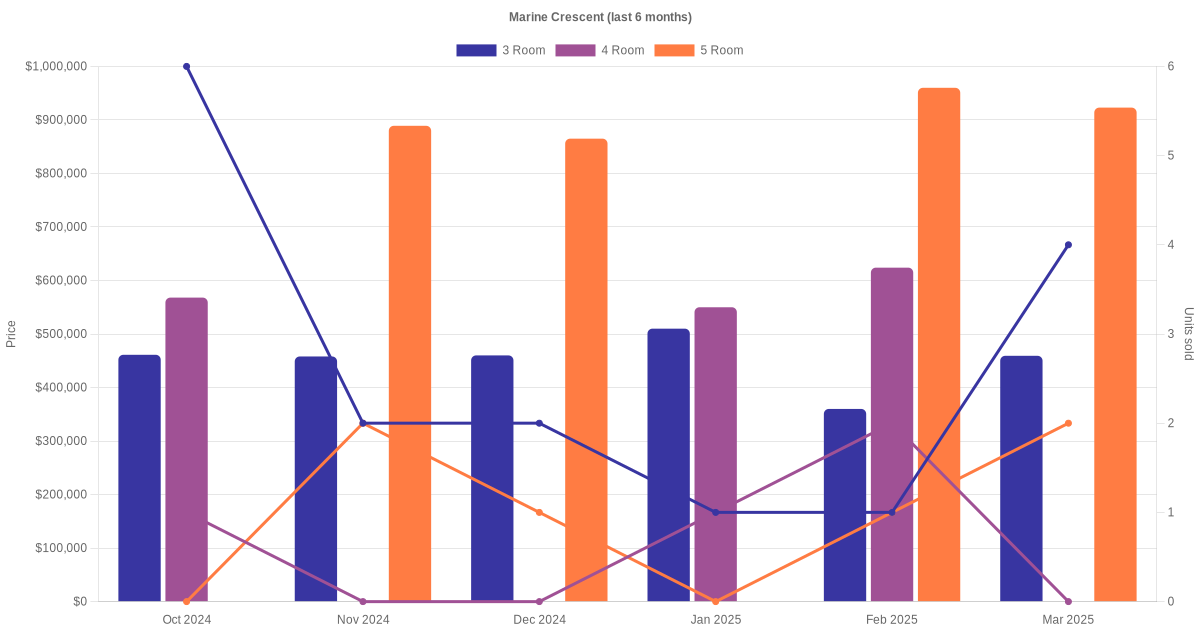 Located along Marine Crescent are various HDB flat types including 3 room, 4 room and 5 room units. Shown below is a view of the resale price and transactions trends, broken down by month, in the last 3 years.