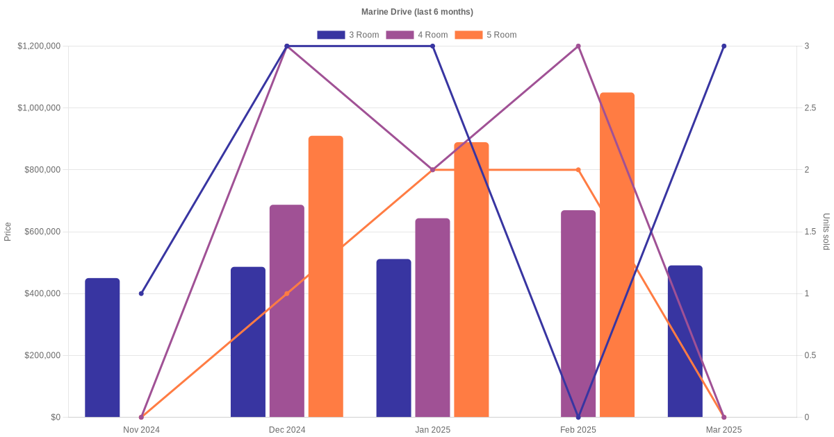 Located along Marine Drive are various HDB flat types including 3 room, 4 room and 5 room units. Shown below is a view of the resale price and transactions trends, broken down by month, in the last 3 years.